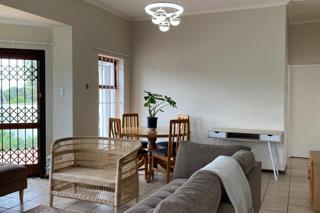 Lounge with lounge-suite, Samsung TV & dining room with round dining table and 6 chairs leading onto balcony & lovely private garden.