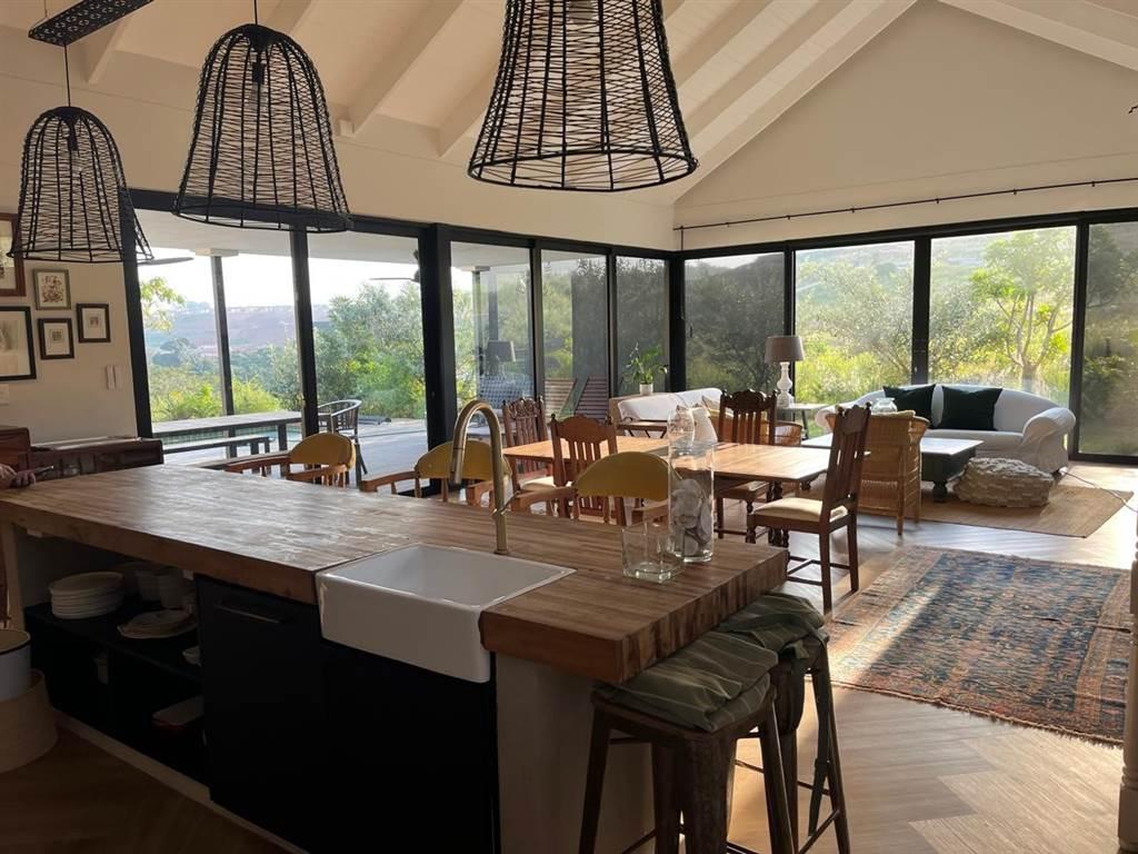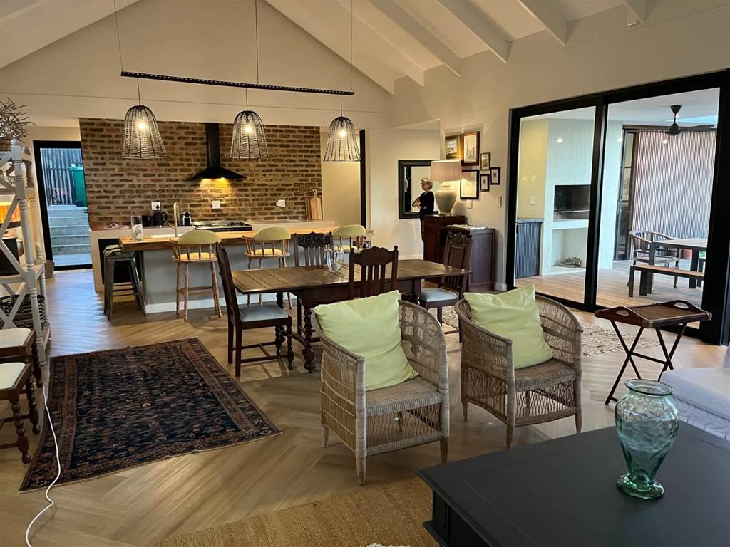 Bright & Airy Open Plan Living Space. Kitchen, dining room and lounge opening onto to a large covered deck perfect for entertaining, built in braai, pool and a beautiful garden leading onto a conservancy.